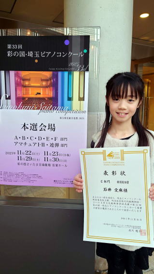 2025年 第33回彩の国・埼玉ピアノコンクールC部門(小学校5、6年生の部)に於いて、石井愛麻さんが昨年の銅賞に続き今年も特別奨励賞を受賞し表彰されました。 おめでとうございます!! M・Fさん 埼玉大学教育学部 学校教育教員養成課程小学校コース 芸術専修音楽分野 合格